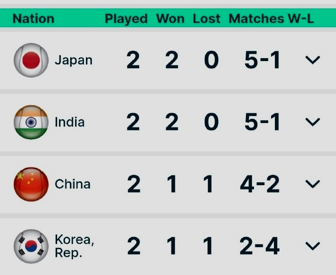 我们再来关注比利-简-金杯亚大区一组的赛况。在小组赛第二轮对决中,中国队的蒋欣玗/袁悦虽然在双打中胜出,但是杨钊煊、郑妩双在单打中落败,因此中国队以大比分1-2负于韩国队,小组赛两战一胜一负,目前排在小组第三名。