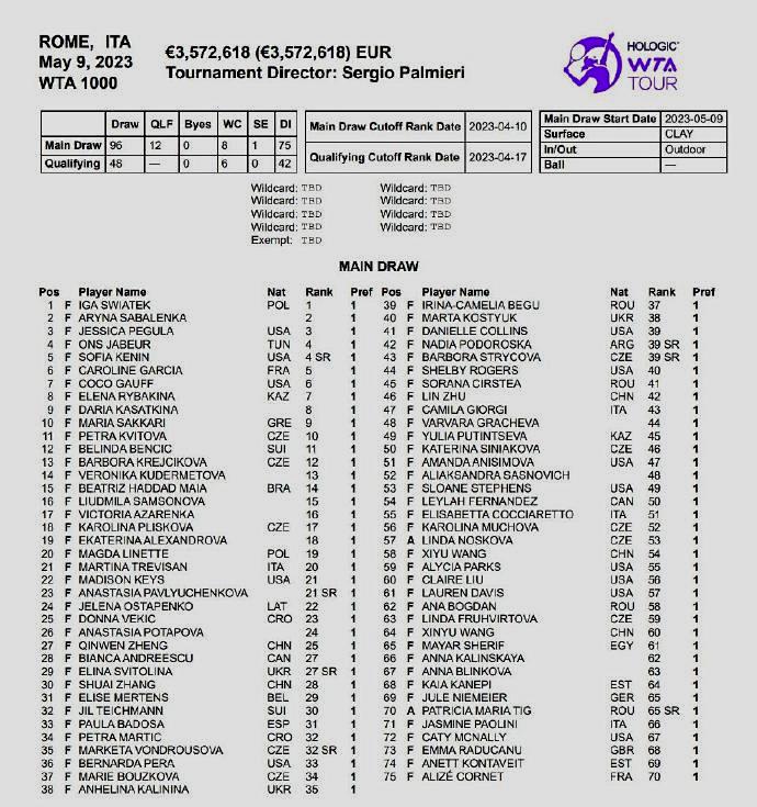我们再来关注赛事消息。北京时间昨晚,将于5月9日开赛的WTA1000罗马站公布了参赛球员名单,世界排名TOP25的球员悉数出战。中国一姐郑钦文、老将张帅和朱琳、王曦雨、王欣瑜共五朵金花,依靠世界排名直接入围正赛。