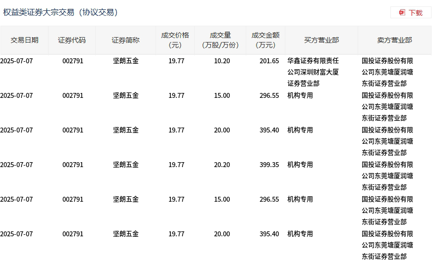 7月7日,坚朗五金大宗交易成交100.4万股,成交额1984.9万元,占当日总成交额的21.71%,成交价19.77元,较市场收盘价21.31元折价7.23%。