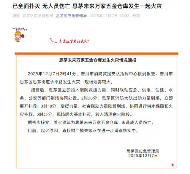 接警后,思茅区立即投入消防救援力量,同时联动应急、供电、住建、水务、公安等部门到场协同处置。5时25分,现场明火基本扑灭,转入清理余火阶段。据初步核实,着火建筑为思茅未来万家五金仓库 ,未造成人员伤亡。