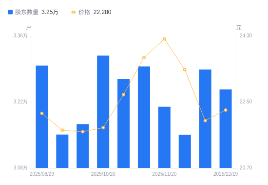 近一年(2024年12月31日至2025年12月19日),坚朗五金A股股东户数从3.01万户,增加至3.25万户,增幅7.95%,区间股价下跌4.71%。