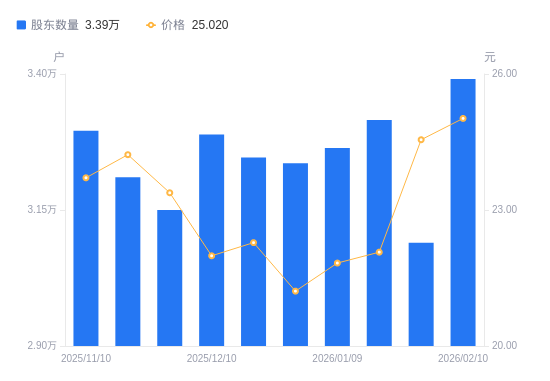 近一年(2025年2月28日至2026年2月10日),坚朗五金A股股东户数从3.06万户,增加至3.39万户,增幅10.64%,区间股价上涨6.87%。